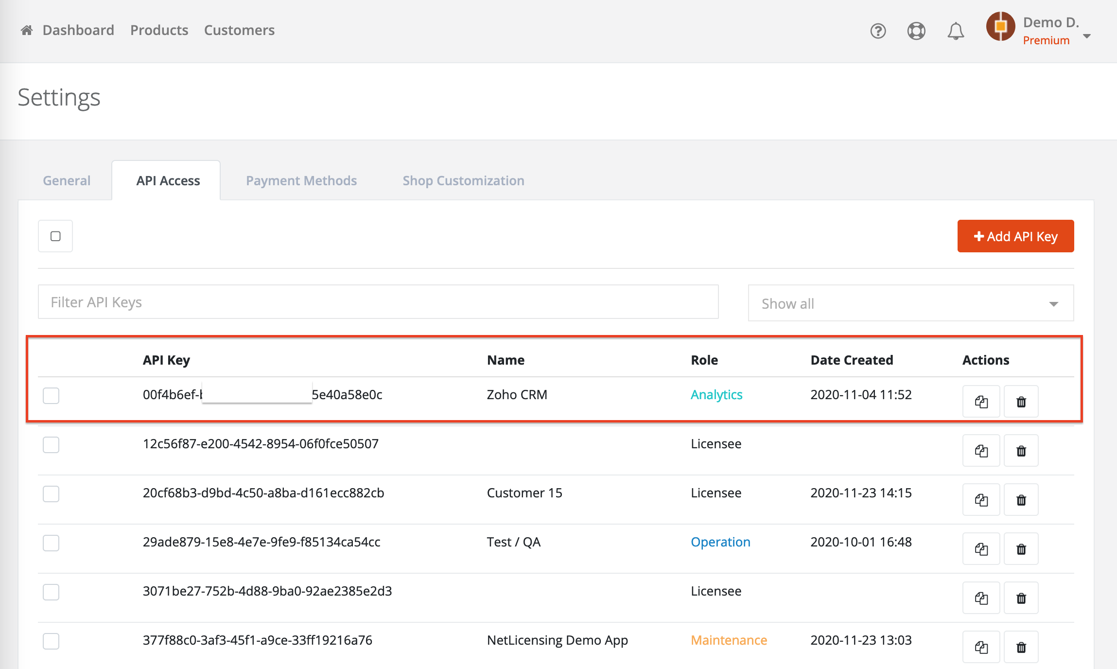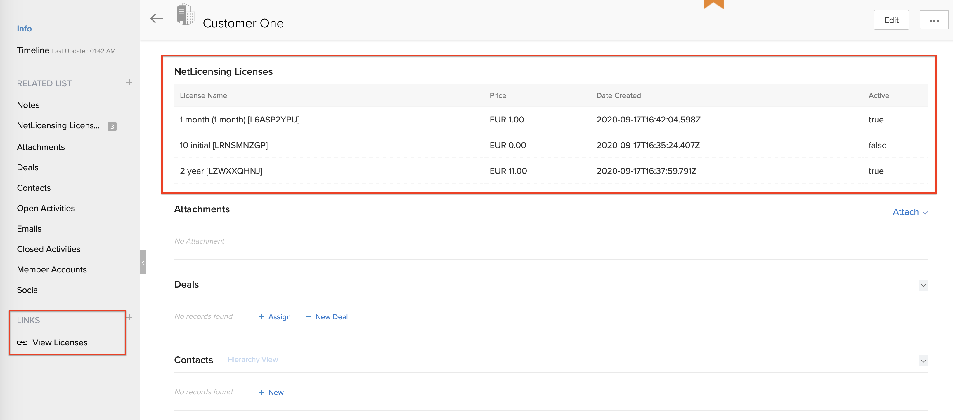 Labs64 NetLicensing for Zoho CRM integrates your customers' entitlements in NetLicensing with your CRM system. The extension adds a new "Customer Number" field to the Accounts module which will be used to retrieve all available licenses for a particular vendor.